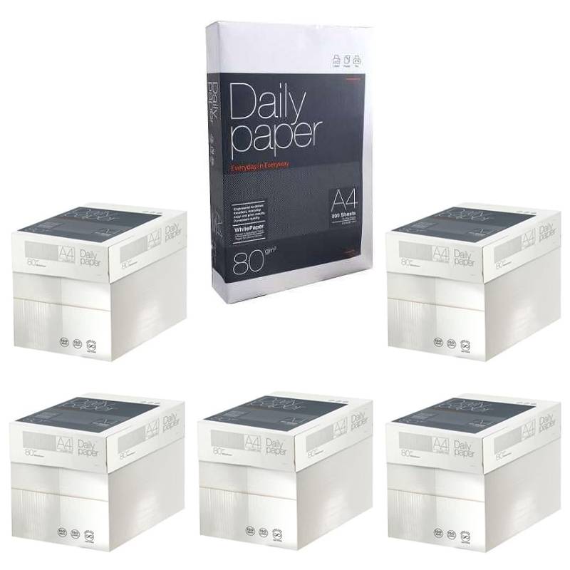 Consigue el mejor precio por volumen con el pack de 5 cajas de folios Daily Paper 80g/m². Garantiza tu stock de 2500 hojas de papel A4 de calidad profesional, perfecto para un uso intensivo en oficinas. Disfruta de una superficie ultra lisa que evita atascos y proporciona impresiones nítidas en cualquier impresora.